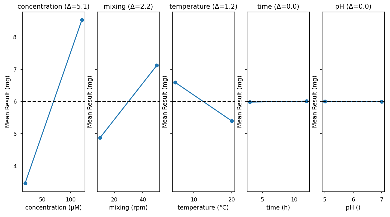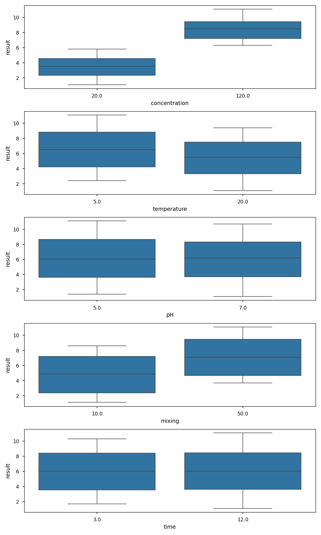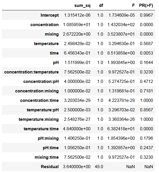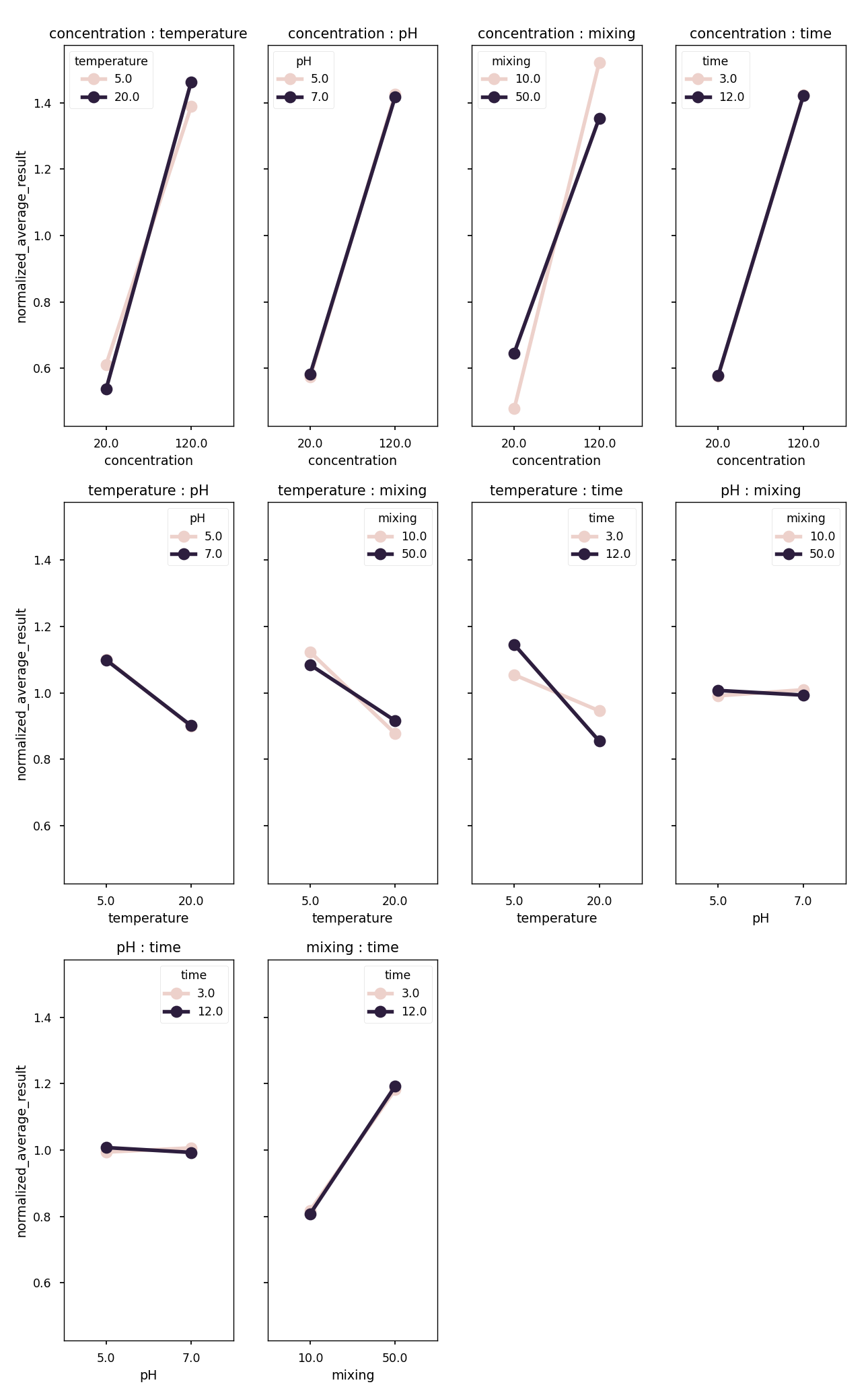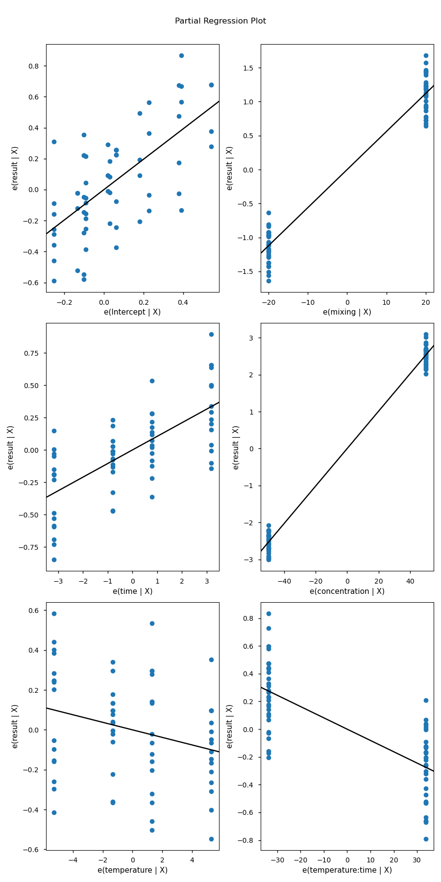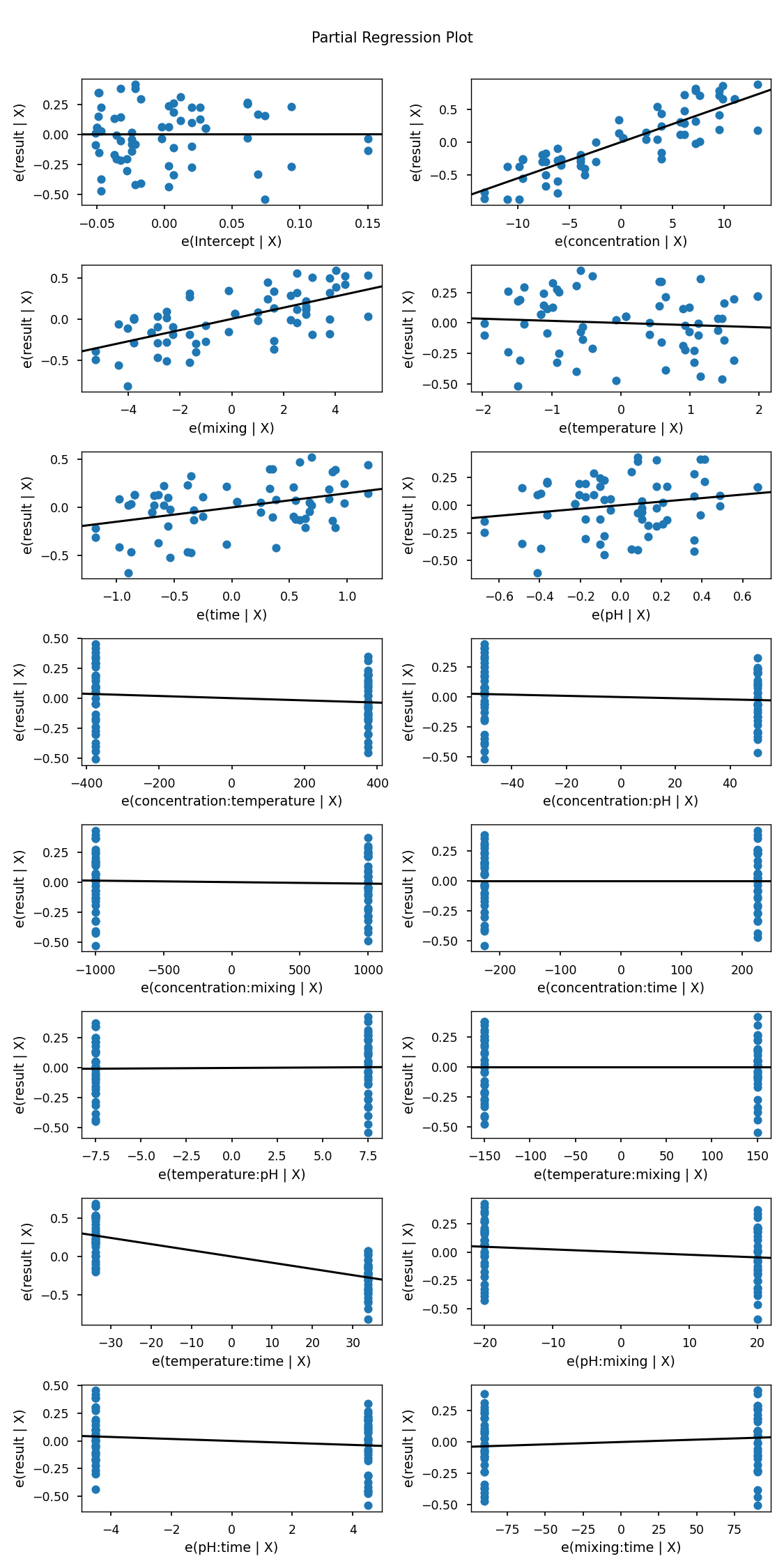 Our statistical model has confirmed that precursor concentration, mixing speed, and reaction time have significant impact on the reaction yield, while reaction temperature, and solution pH do not. What is perhaps most surprising, is that the interaction term between temperature and reaction time is significant. How can this be, and what exactly does it mean? How can temperature have virtually no effect at shorter times, but have a measurable effect at longer time? After scratching his head about these result for a bit, our Chemist realizes that one factor he did not directly control in this experiment is solvent evaporation. At low temperatures, the solvent barely evaporates either at long or short experiment durations, while at increased temperatures, duration of the experiment significantly affects the extent of solvent evaporation. This, in turn, changes another uncontrolled parameter of the reaction: the ionic strength of the solvent. With this insight, the Chemist is now able to come up with an engineering solution (re-design the reactor to prevent evaporation), as well as a new experiment design that involves the ionic strength of the solvent as one of the experimental factors.