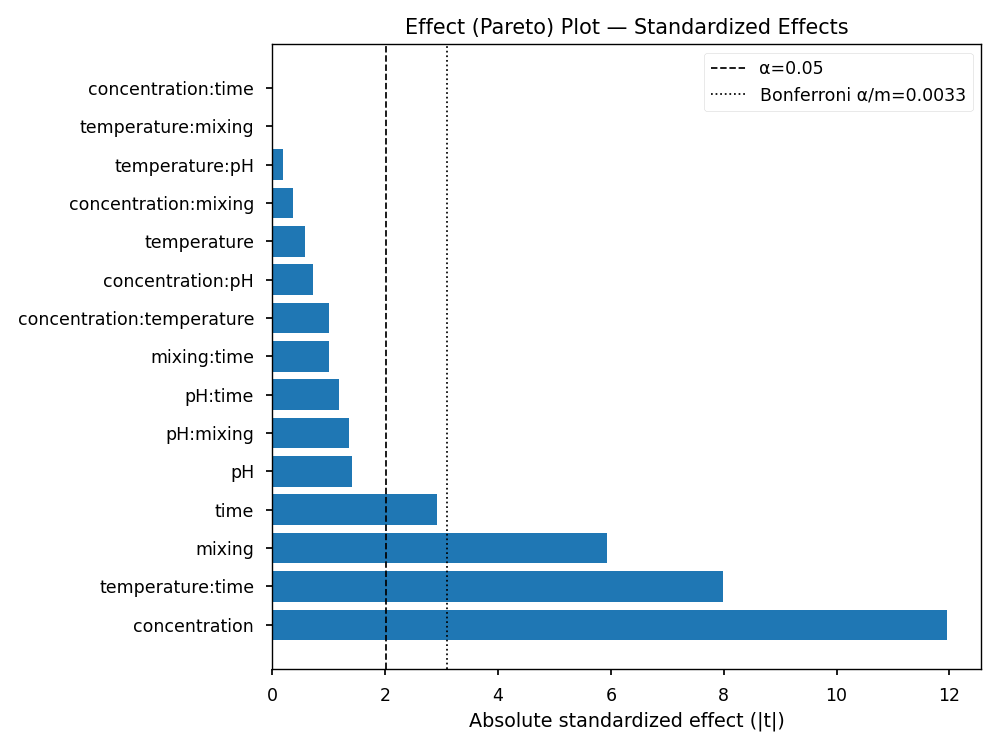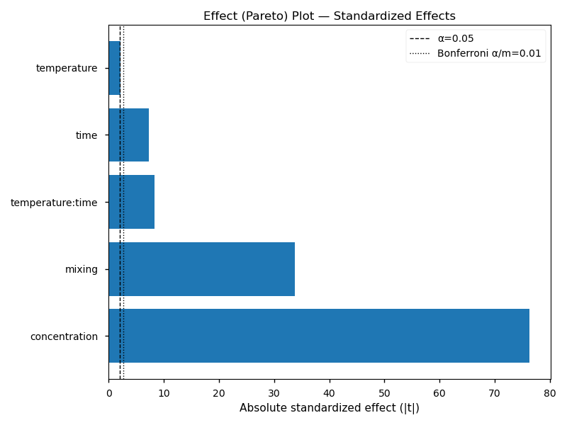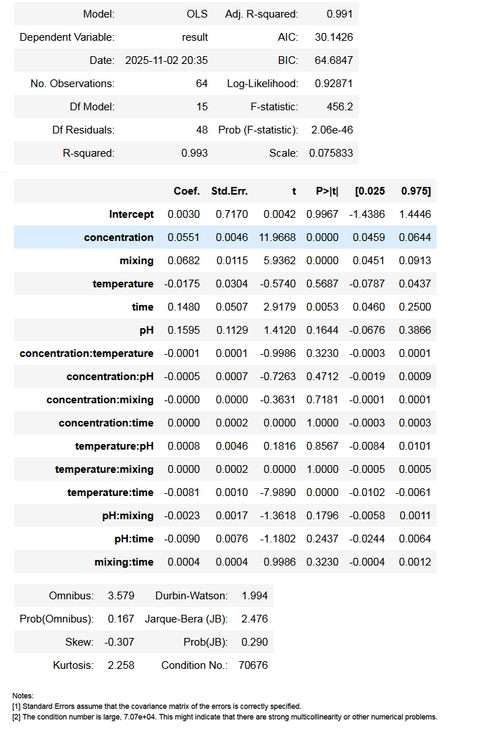 In this tutorial we demonstrated the power of a simple full factorial DOE study to interpret real interactions in practical process terms. In future notes we will extend this workflow to more economical designs, introduce screening and blocking, get familiar with more formal lack-of-fit assessments and pure-error checks, discuss factor coding and hierarchical model selection, cover multi-response optimization with desirability functions, and touch on measurement system considerations and power planning for sequential experimentation.