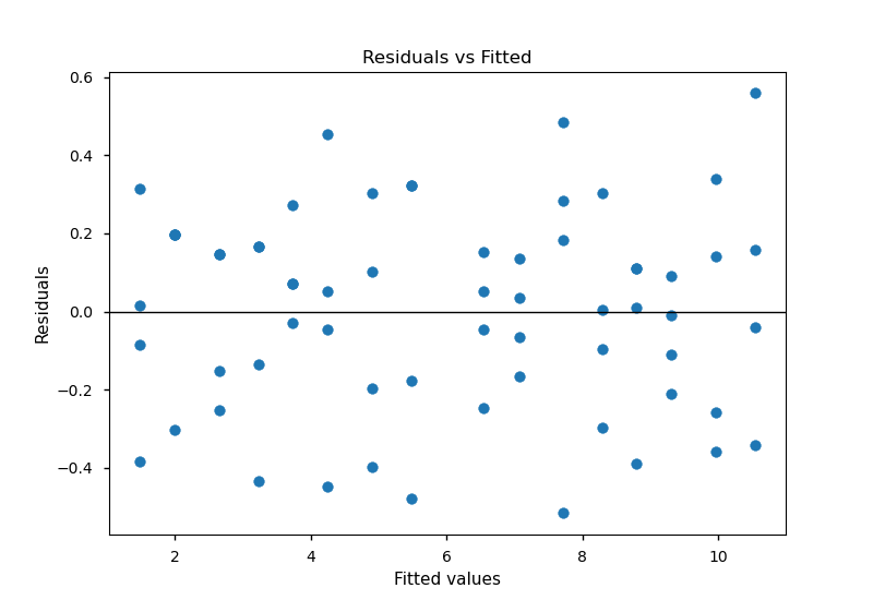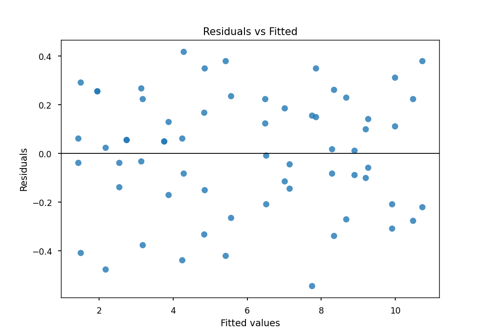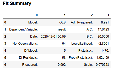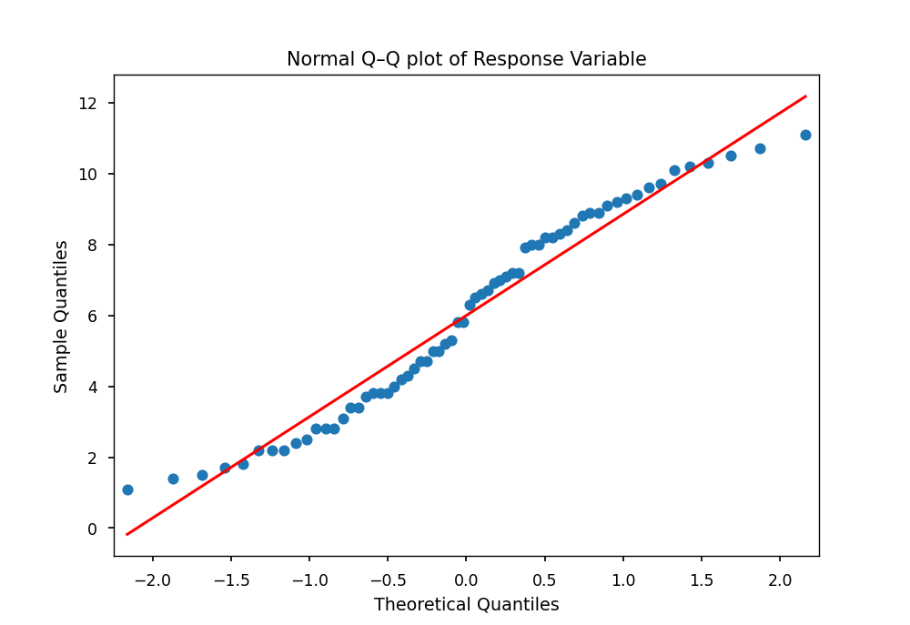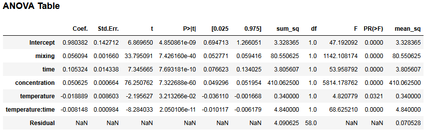 We see that with fewer terms, the time parameter now exceeds our adjustded alpha level of significance. The adjusted \(R^{2} \) remains 0.991, signifying that the removed terms did not explain any of the variability in the results. Both the AIC and BIC parameters went down, AIC from 30.1 to 17.6, and BIC from 64.7 to 30.5, signifying improvement in model quality. The updated model seems to check all of the boxes, so we can end the refinement process here.